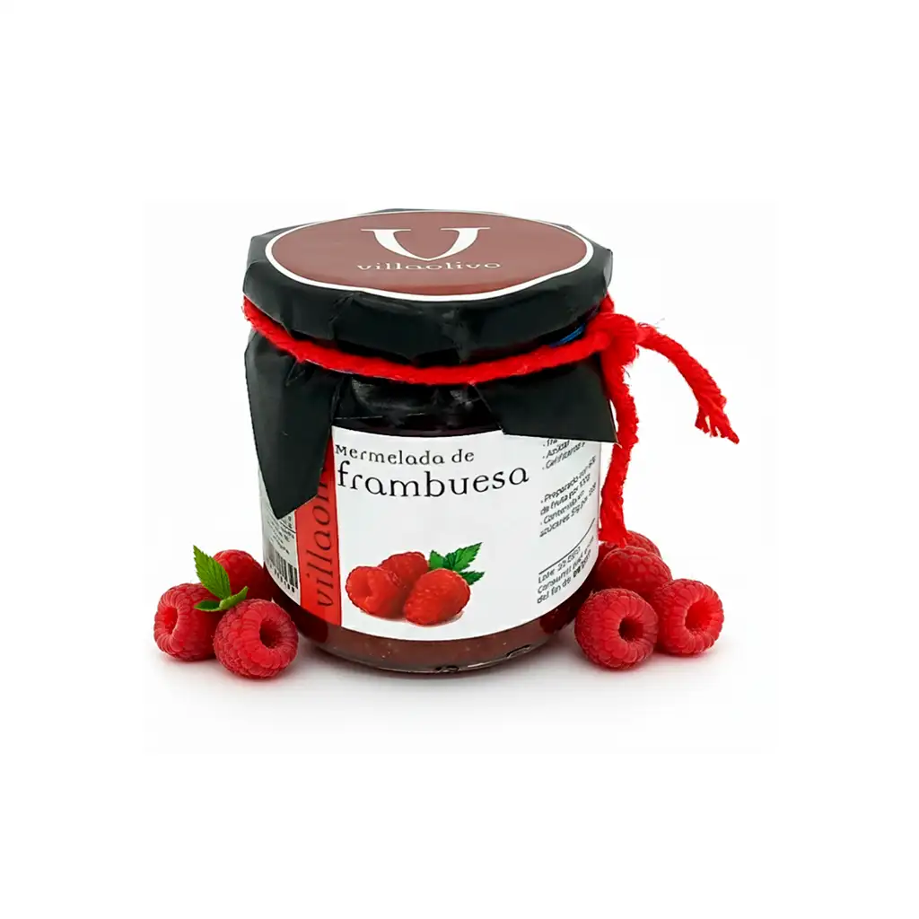 La mermelada de frambuesa Villaolivo captura la esencia fresca y dulce de las frambuesas maduras, ofreciendo un sabor intenso y una textura suave.